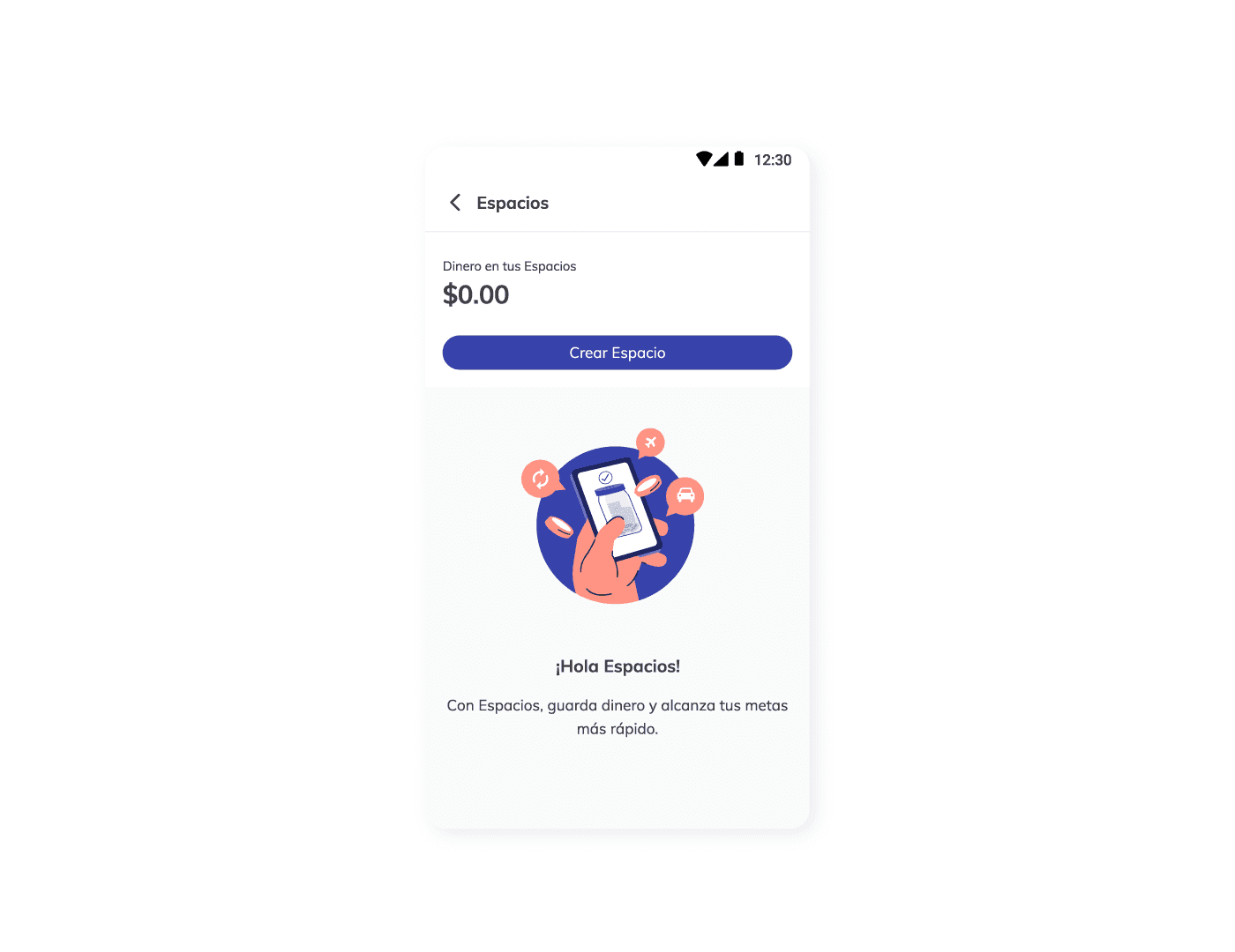 In this case, the challenge was to propose a new empty state design for the “Spaces” section. First, it displays the amount of money the user currently has in their spaces, followed by a CTA in the brand’s primary color that, when tapped, leads to the space creation flow. At the center, there’s an illustration representing saving within the space, accompanied by a welcoming copy that highlights the features of this section.