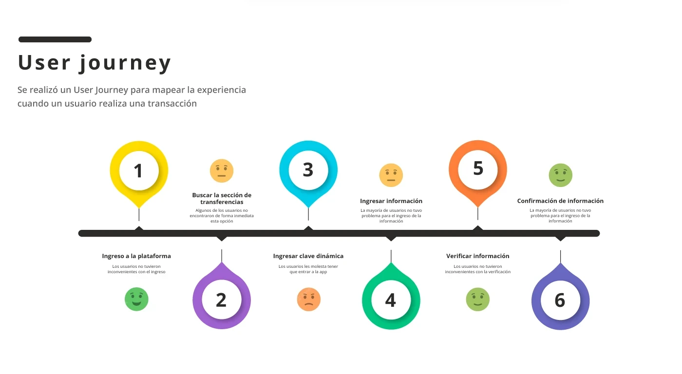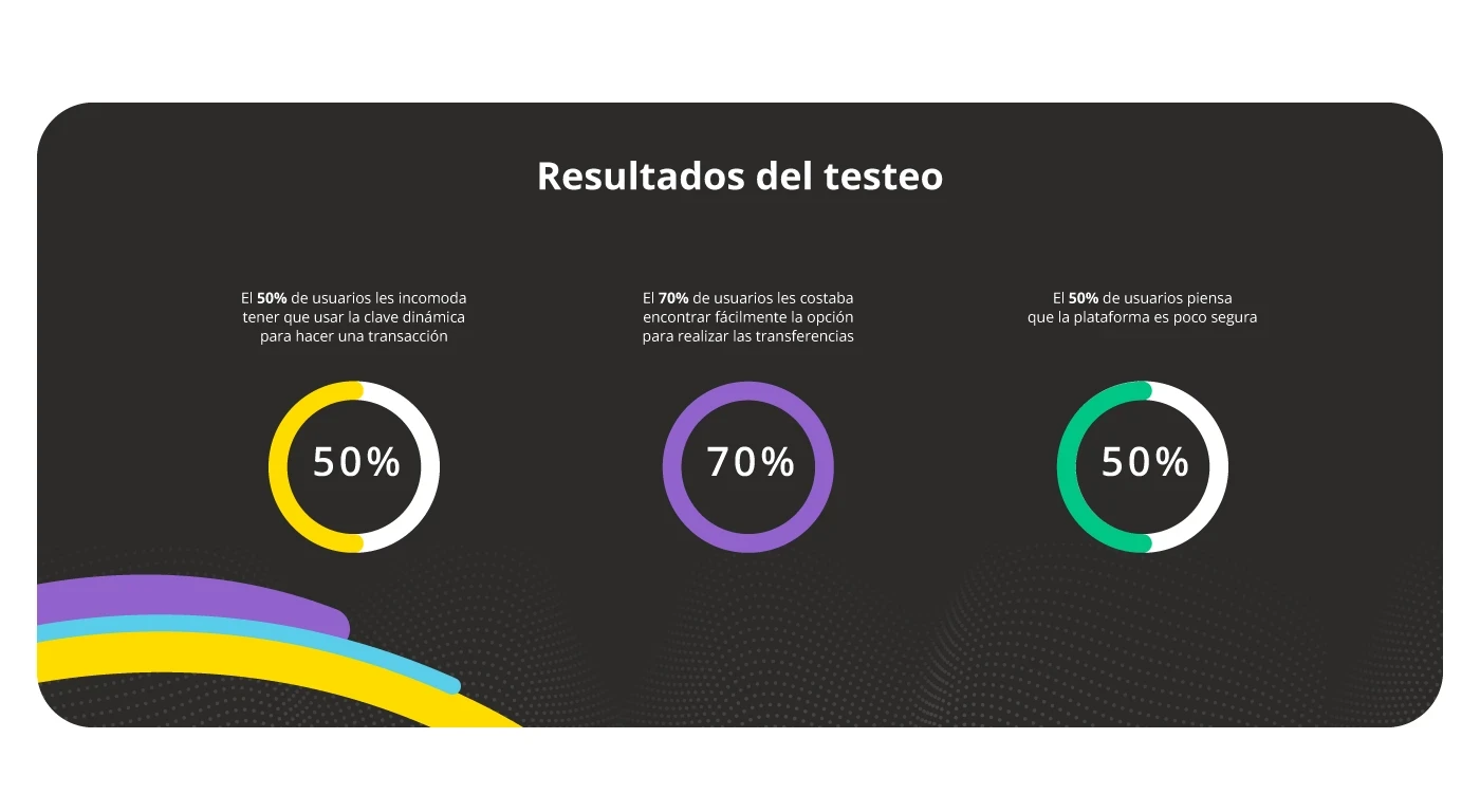 We conducted a usability test of the current platform and found that 50% of users felt uncomfortable using the dynamic key to complete a transaction. Additionally, 70% of users had difficulty easily finding the option to make transfers, and another 50% believed the platform was not very secure.